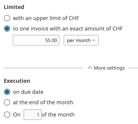 Most Swiss e-banking providers use eBill which has an automatic bill approval feature called Standing approvals. With this feature, you can auto-approve all your reoccurring payments based on if they match certain criteria. One method to do it is to select the fixed amount of your reoccurring payment and save it. This works great for repetitive payments such as cellphone bills, insurance, healthcare which usually stay the same unless something out of the ordinary happens.